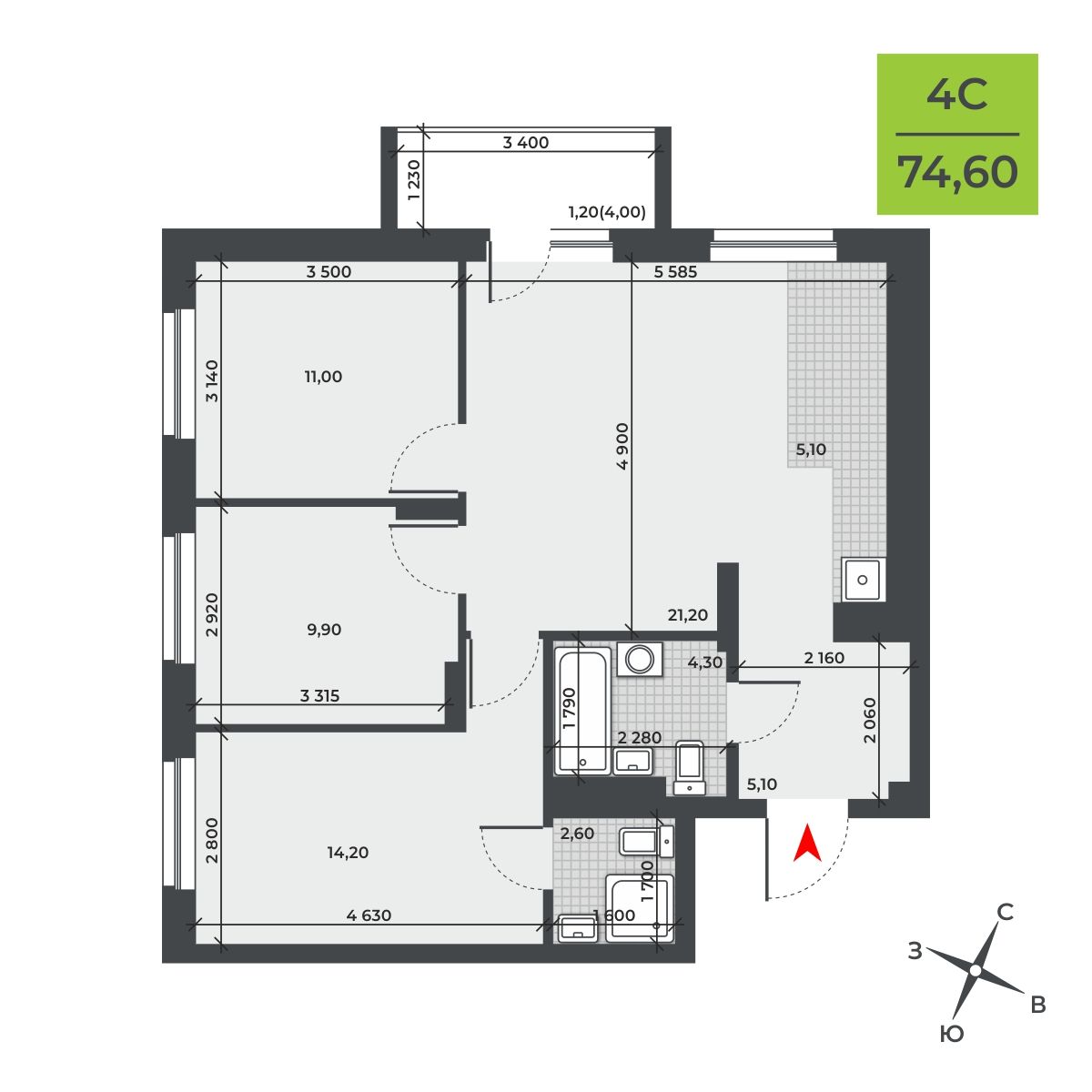 4 комнатная, 69 м2 8 123 760 ₽ 9 026 400 руб или 117 736 ₽ за м2